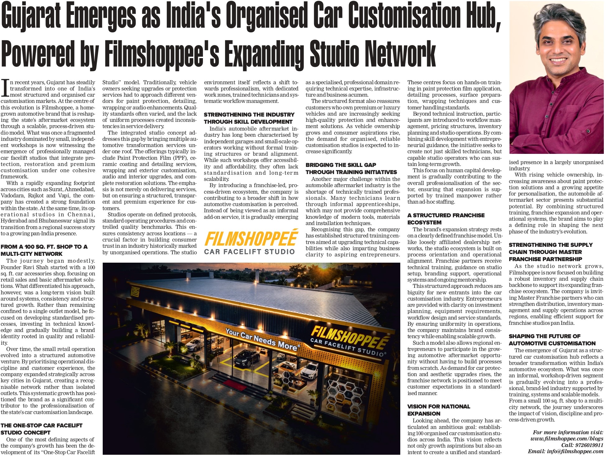 Filmshoppee’s journey and structured expansion model have been recognized by national newspapers. The coverage showcases how Gujarat is emerging as a serious car customisation hub driven by organized infrastructure, skilled manpower and professional franchise systems.